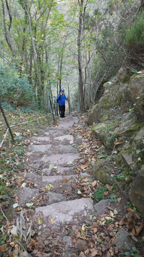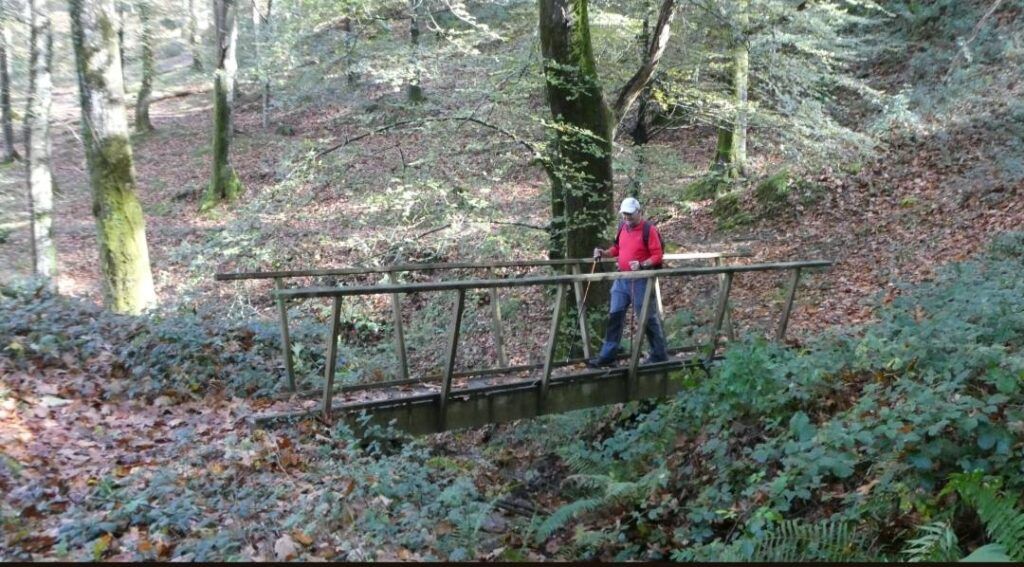 El senderista deberá superar en un principio una corta pero muy pendiente “aldapa”, que es un derrumbe inclinado de descarga de material, que se hacía con vagonetas y cables. Una vez superada nace un perfecto camino de monte por la ribera derecha que llanea en balcón en un frondoso bosque, sobre las aguas del arroyo, que circula por el fondo del valle.