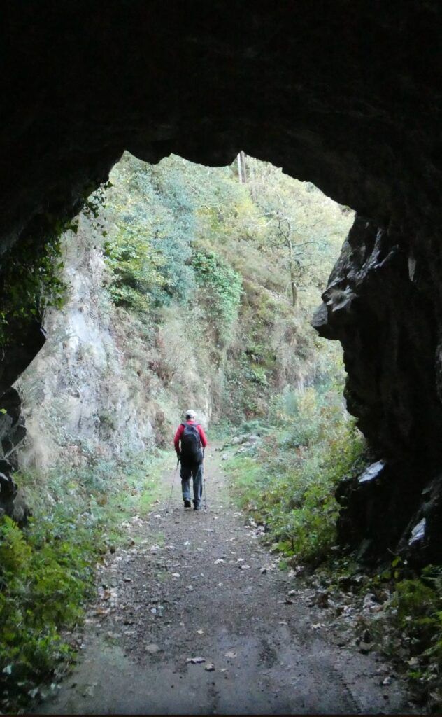 El excursionista derivará sus pasos a la derecha para iniciar la travesía de los cinco túneles horadados en la rocosa y llamativa peña de “Askain gain”, y que facilitan la entrada al misterioso valle de las minas de Meazuri. Entre el primero y el segundo se sitúa el más apropiado mirador (fotografía) sobre la impresionante y ruidosa cascada de Irusta, que en su cabecera recoge las aguas del Aitzondo.