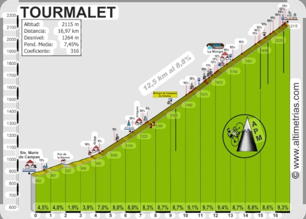 Tras bajar a Sainte Marie de Campan, comienza la ascensión al coloso Tourmalet desde la vertiente «más suave». Son casi 17 kilómetros al 7,4%, pero realmente duros los últimos 12 superando de largo el 8% como vemos en el gráfico de Altimetrías. Lo más espectacular la parte final desde la estación de La Mongie hasta la misma cumbre con la estatua del ciclista y el bar con recuerdos del primer ganador del Tour.