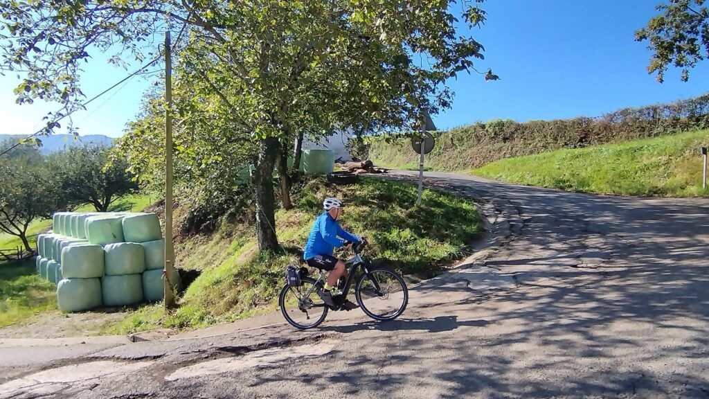 Nos enfrentaremos a una ascensión de 2,4 kilómetros con una pendiente media del 7,4 % ,aunque con porcentajes que superan las dos cifras. Un primer repecho, muy duro, al 10 y 14% con vistas cada vez más aéreas de Lazkao, nos lleva hasta el cementerio y un poco más adelante, ya en zona despejada de árboles, hasta un primer caserío.