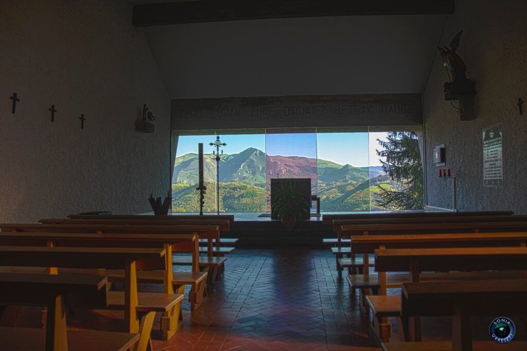 En lugar de retablo tiene un espectacular ventanal a la Sierra de Aralar (que también tiene su Santuario dedicado a San Miguel in excelsis), con el Txindoki justo en medio. Numerosas bodas se han celebrado aquí.