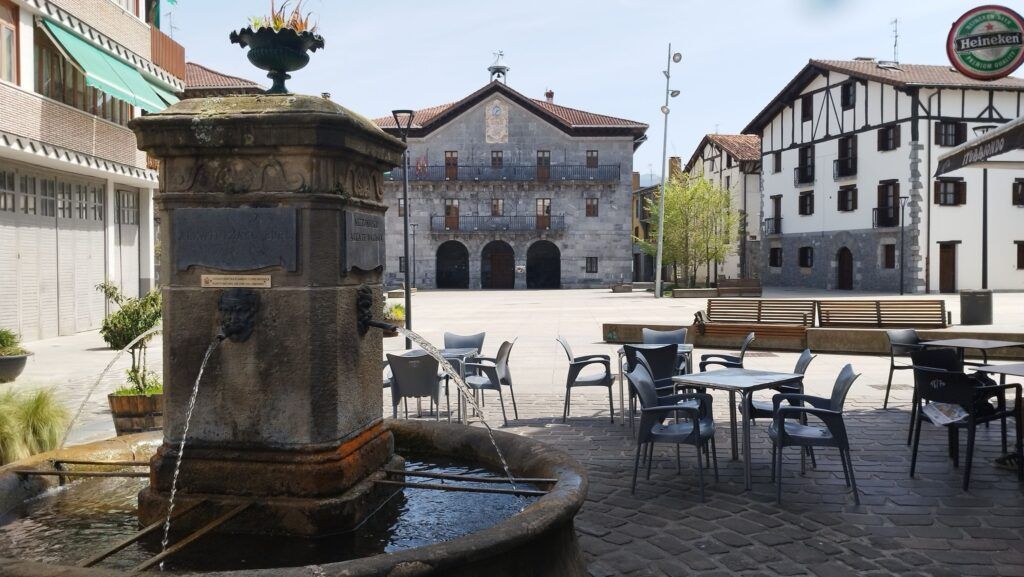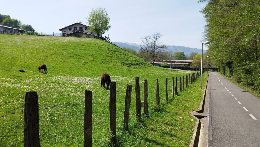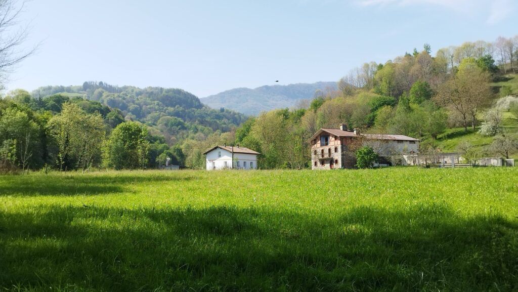 Tras pasar el campo de fútbol, y junto al riachuelo, vamos dejando una zona de polígonos industriales hasta llegar a unos bonitos prados bajo la sombra del emblemático monte Hernio. Llegaremos a una bifurcación con un cartel explicativo. Las dos llevan a Asteasu, pero os recomiendo ir por la izquierda a fin de ver otro par de bonitos caseríos muy bien cuidados. Es de agradecer que todavía se mantengan y se sigan cultivando sus huertas, pues así se obtienen inmejorables productos gastronómicos Kilómetro 0.